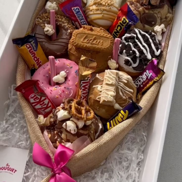 Susunan 10 donat besar menyerupai buket cantik. Cocok untuk ulang tahun, anniversary, atau hadiah romantis yang berbeda dari biasanya.